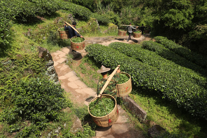 5月3日,武夷山市天心村村民挑着茶青下山。新华社发(邱汝泉摄)